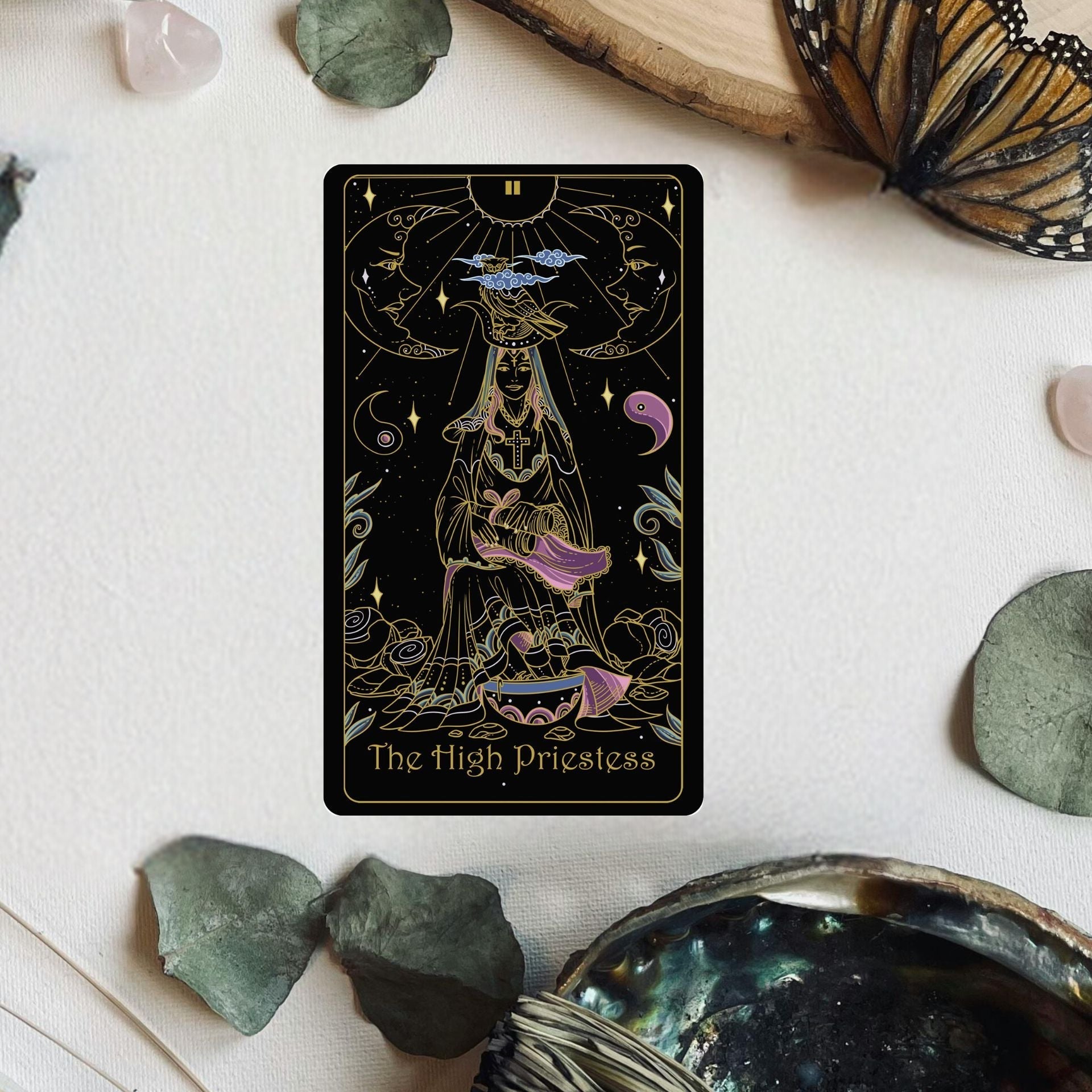 In the Tridevia Golden Foil Tarot Deck, the High Priestess sits between two yin and yang symbols. This imagery reflects the High Priestess's balanced nature and shows us that she can calmly understand the dark and light within the universe. An owl is perched above her head, representing her knowledge and wisdom.